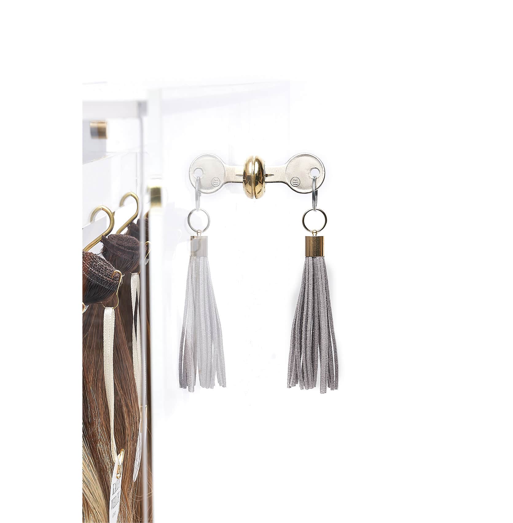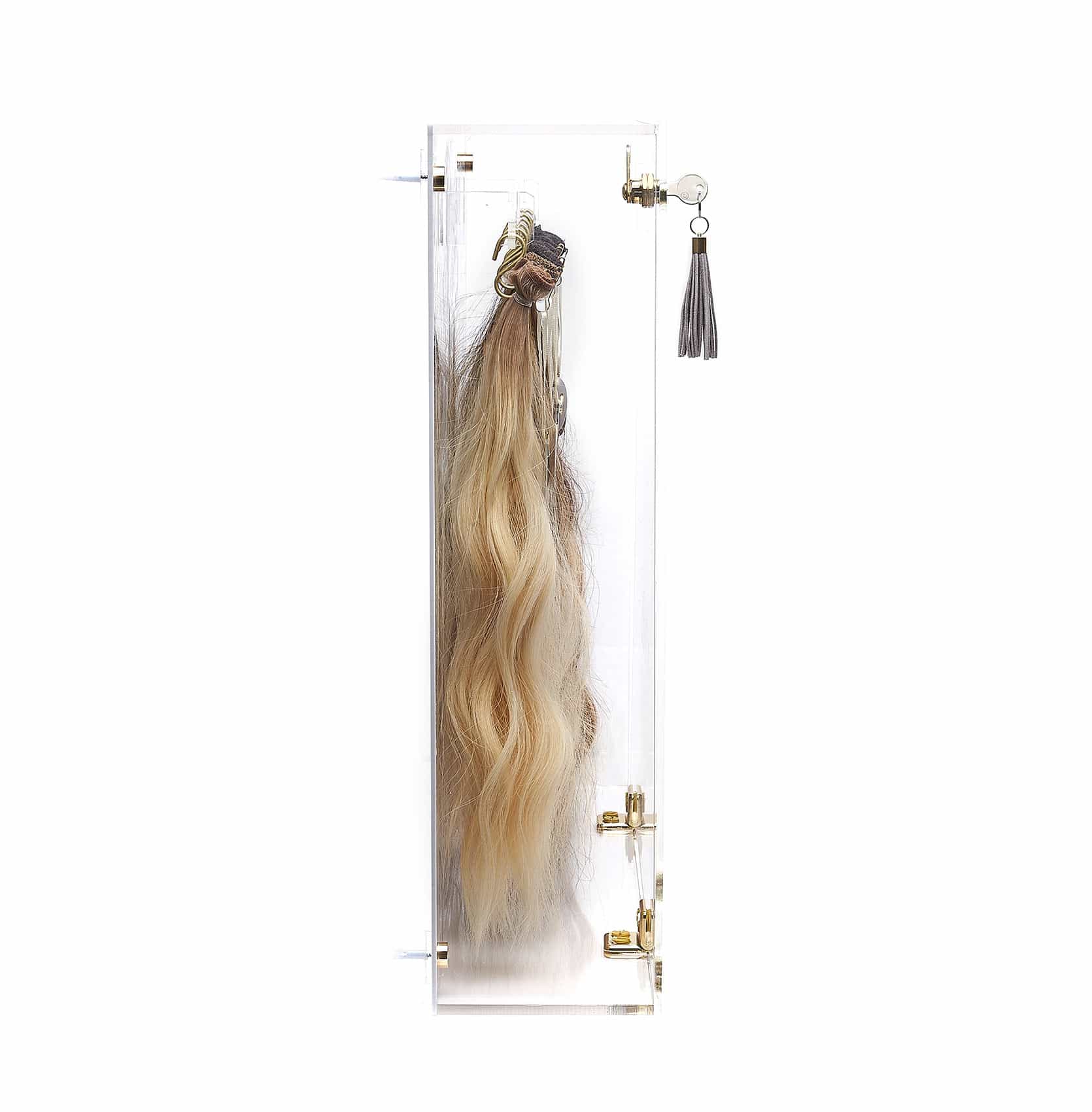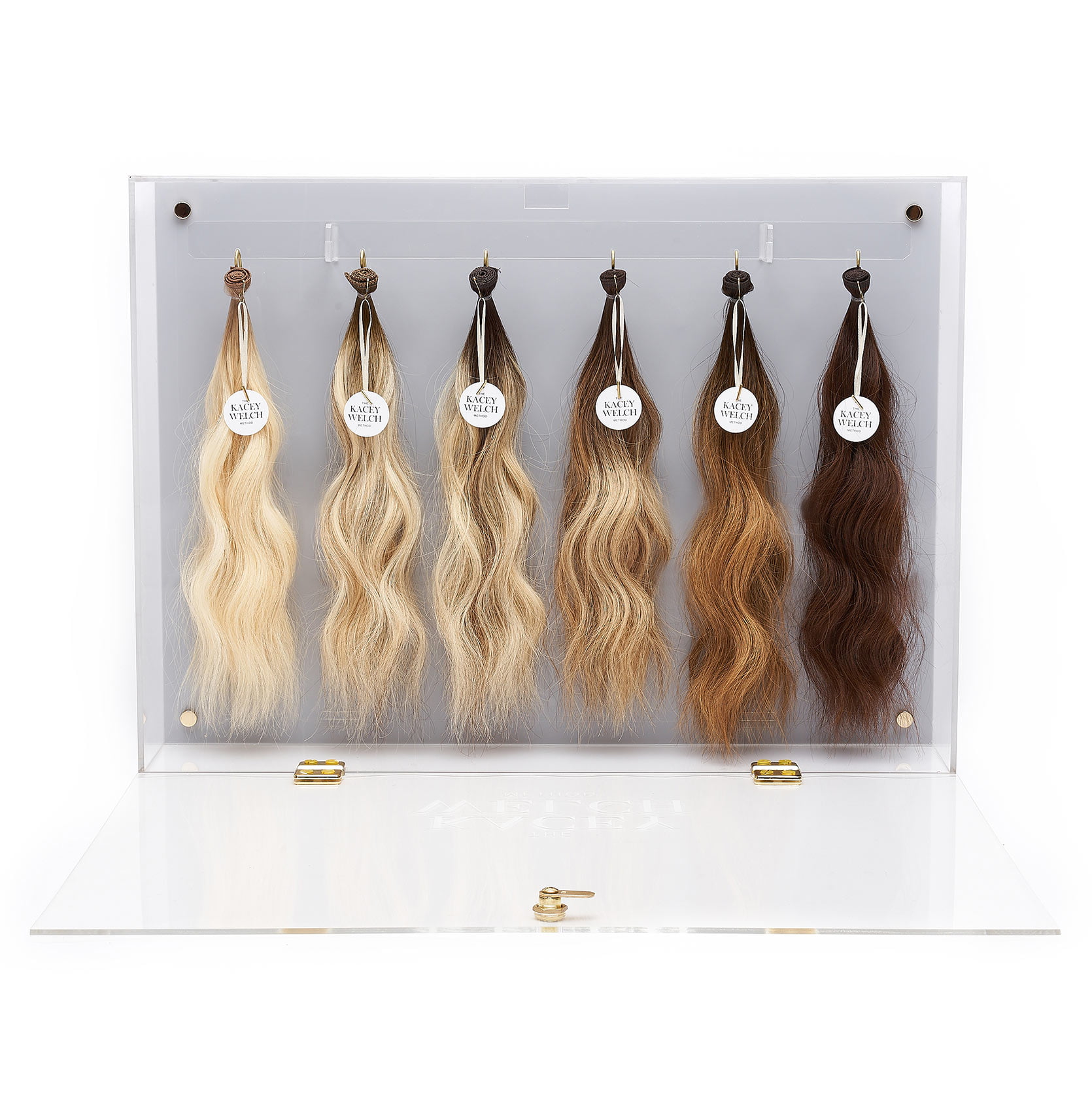 Looking for a way to display your Silk Wefts? Look no further than this gorgeous custom lucite display case. Designed to hold all six colors of hair—just attach silk wefts with the included hooks—and show off the full range. The showcase screws directly into any wall and locks for safe keeping. The Silk Wefts are easily removed for client demos and then just as easily stored, keeping them looking amazing pretty much forever.