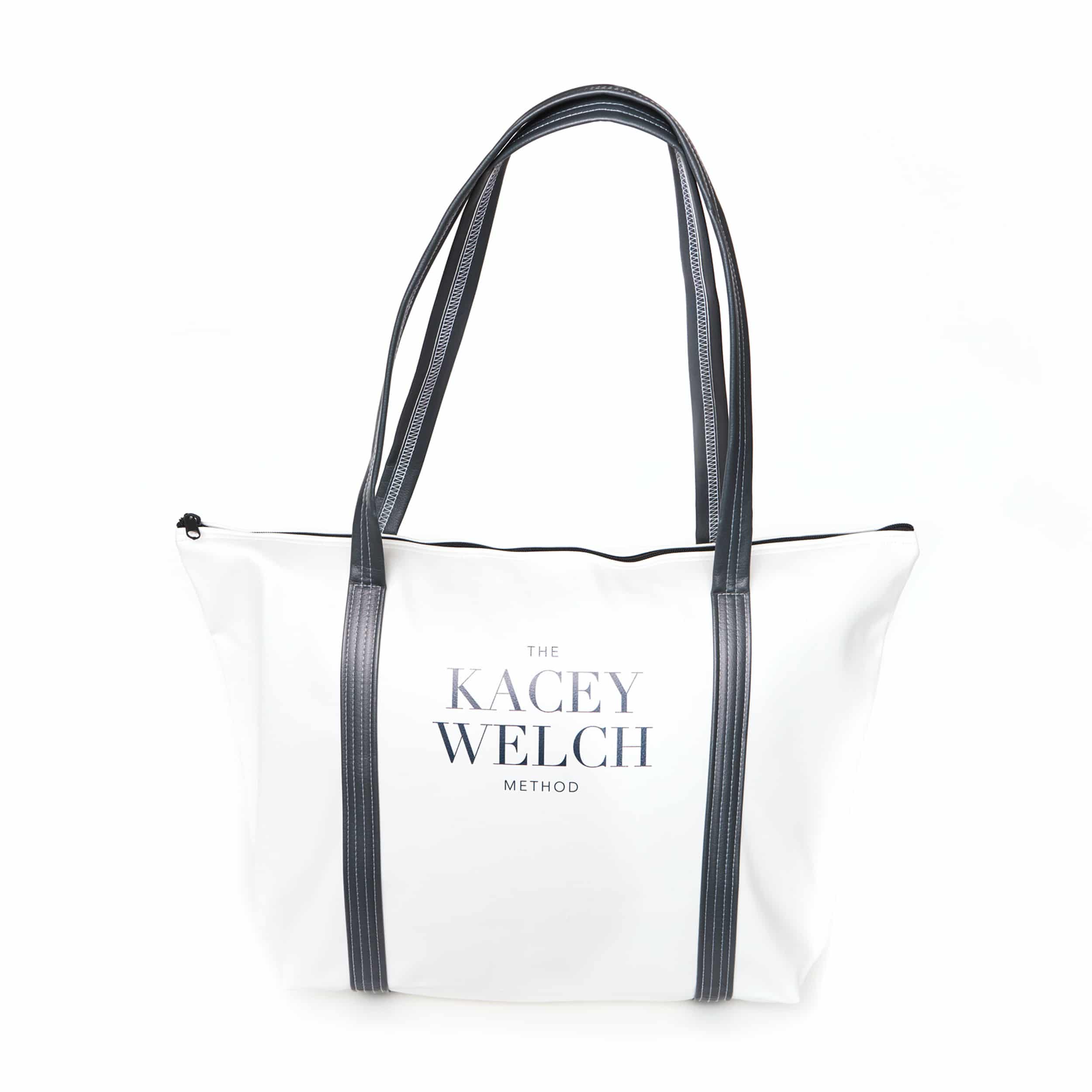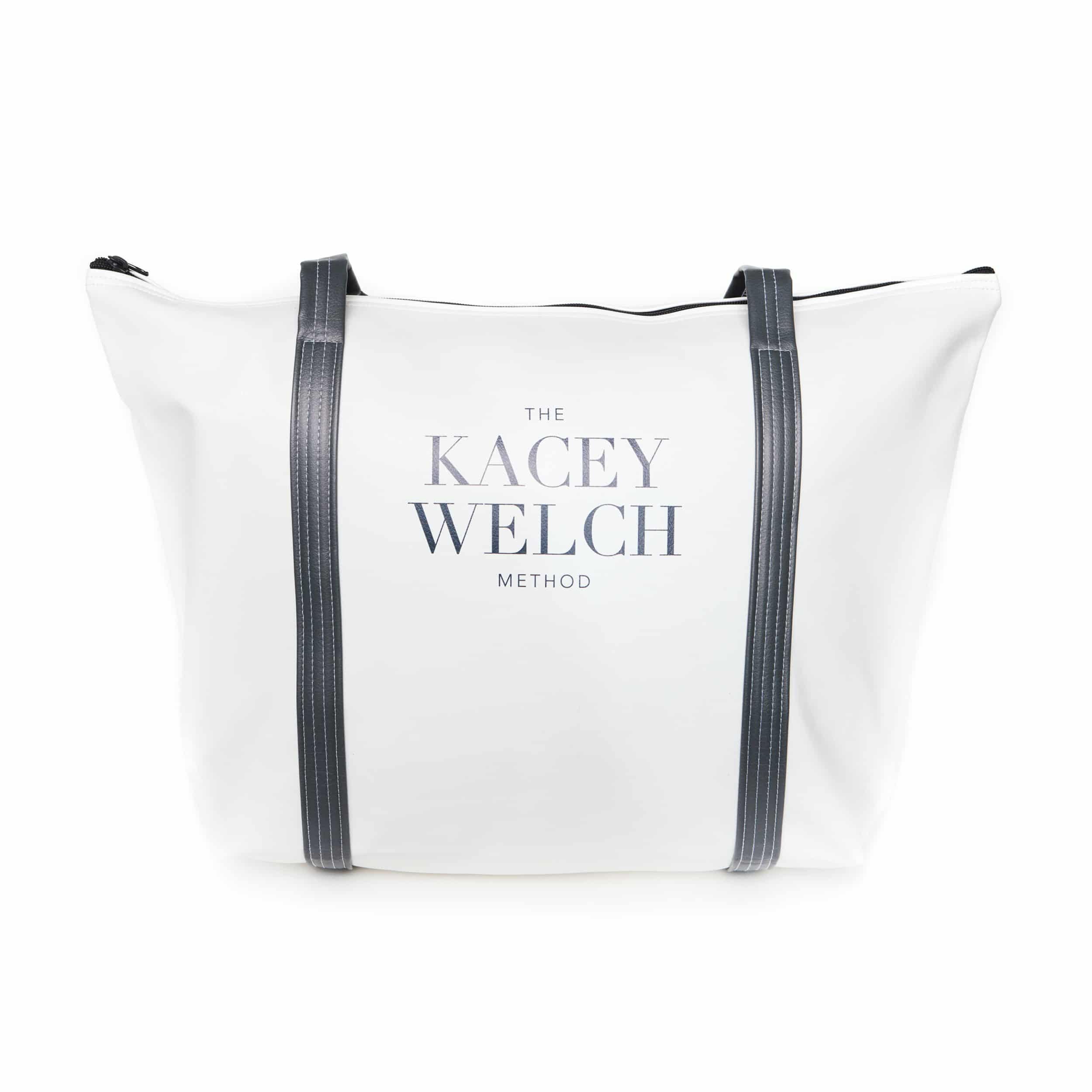 Large Weekender tote bag in white vegan leather, featuring The Kacey Welch Method logo. Measures: 21.75″ W x 13.5″ H x 7″ D.